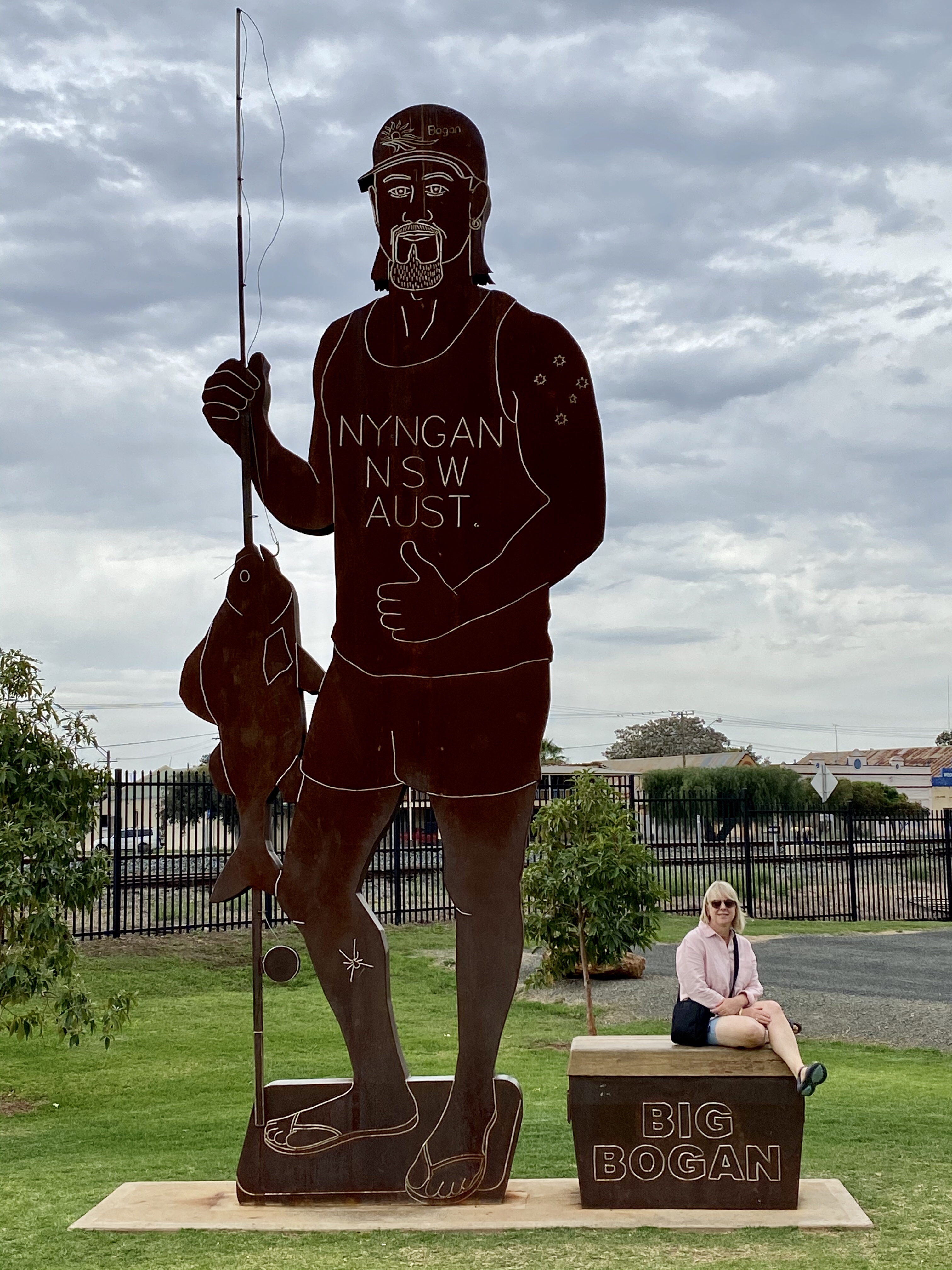We started seeing larger gum trees and shrub was replaced by agriculture as we approached Nyngan. Nyngan is a rather nondescript town, located on the Bogan river in the Bogan shire. It is the proud owner of the Big Bogan statue, another of those typical Australian “big things”.