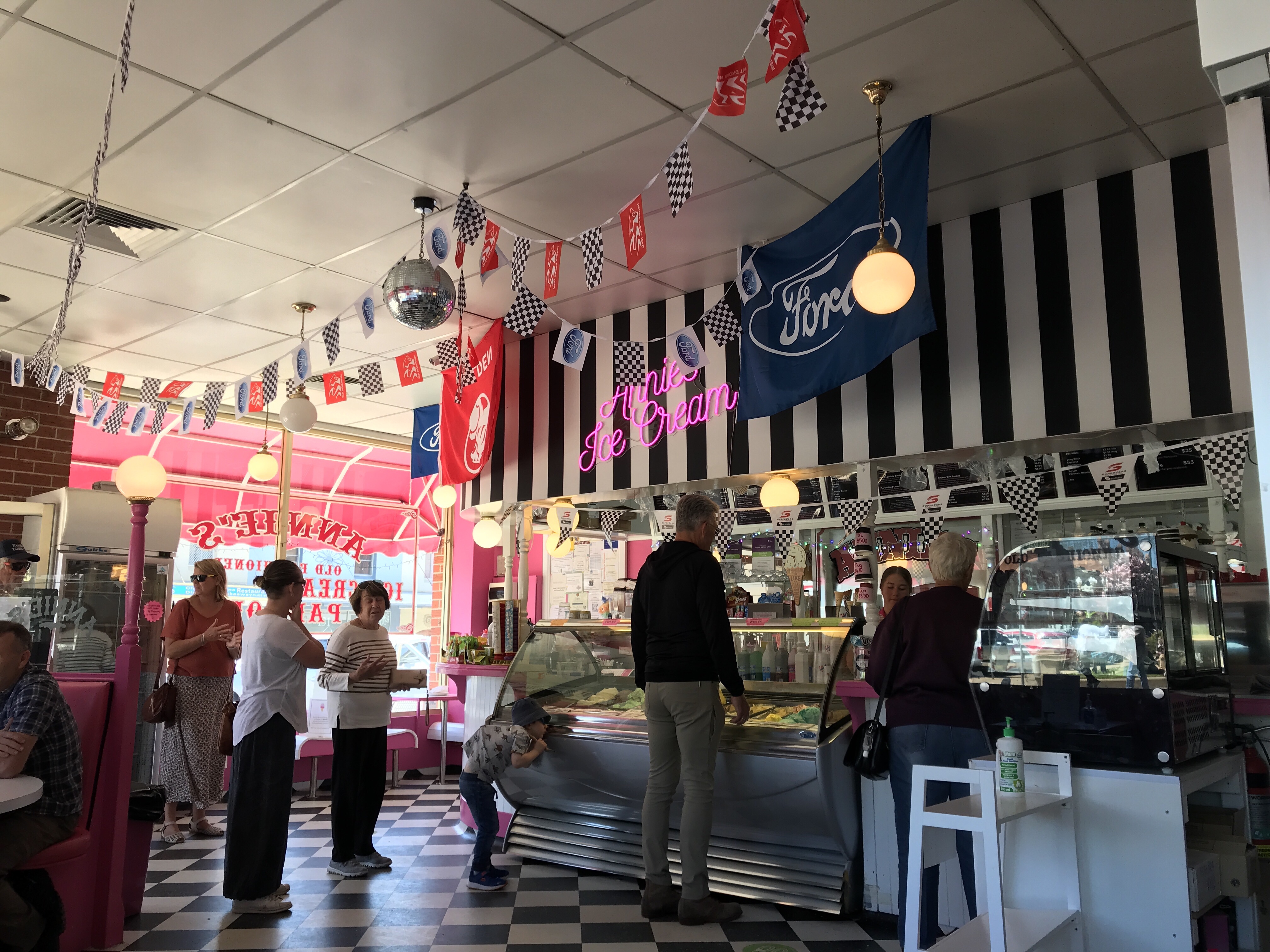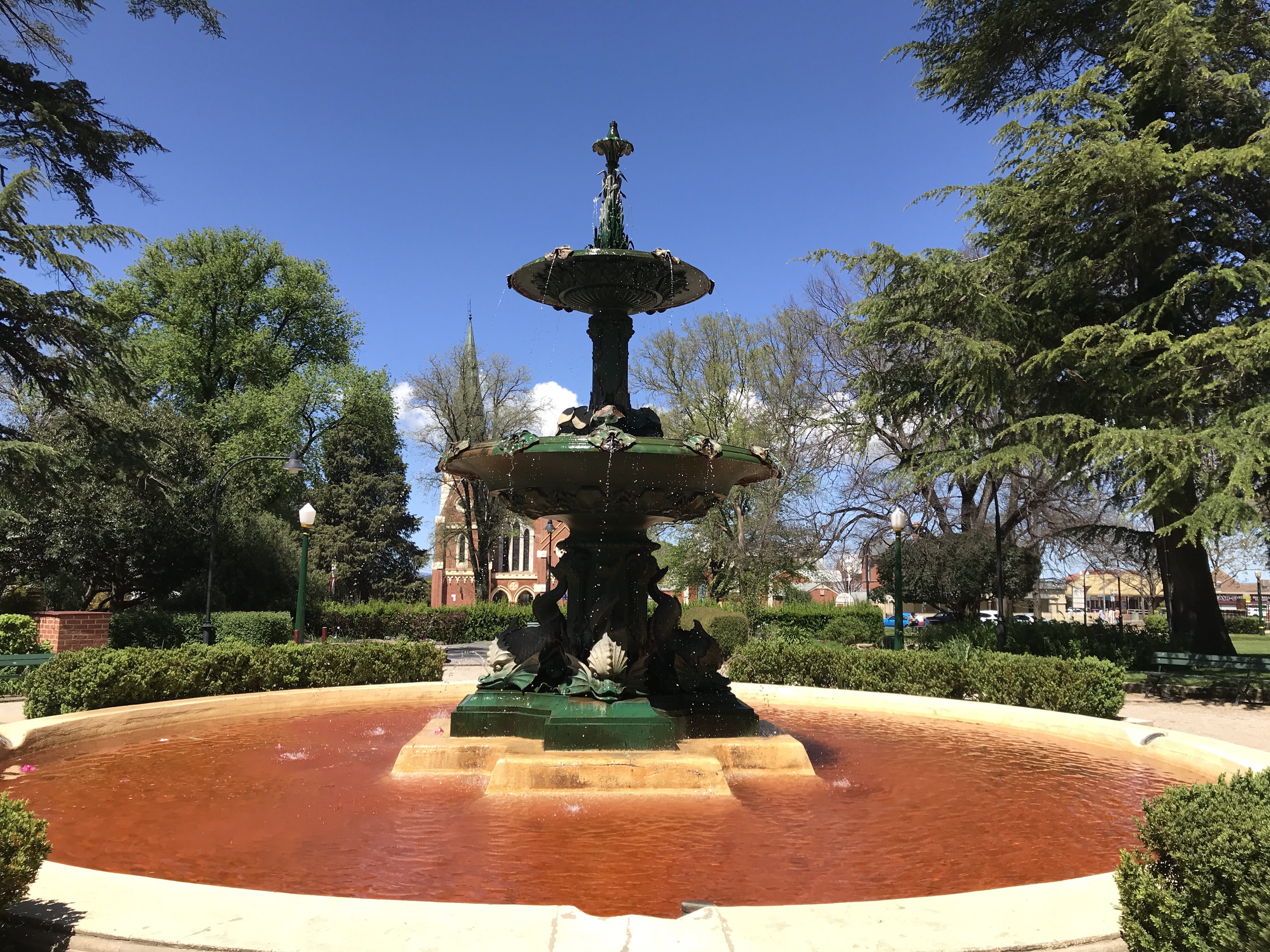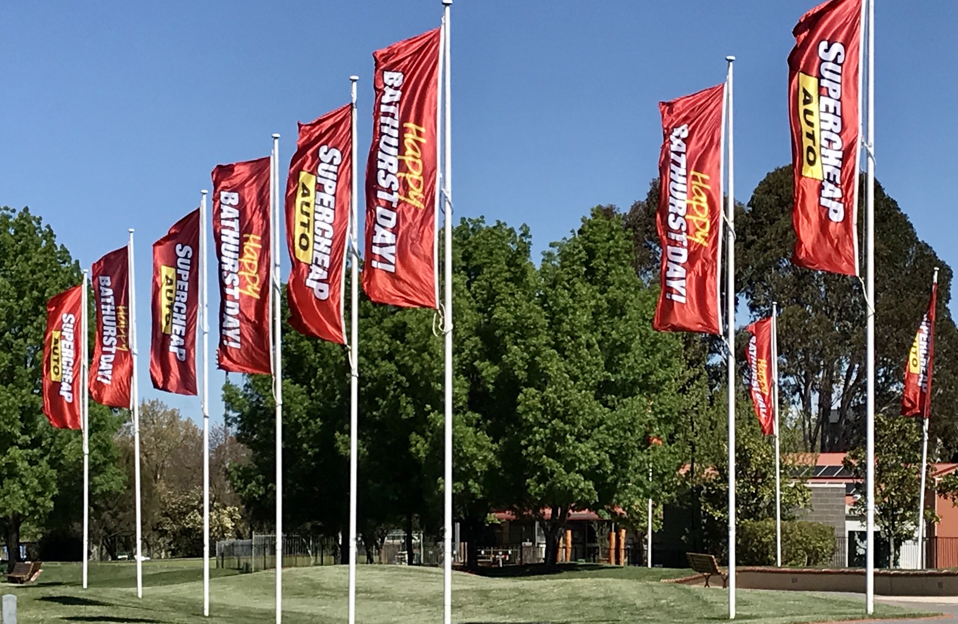 Alas, the lead up to “The Race” was rather tame. Oh, I did see a dad in a Holden shirt, proudly pushing his toddler in a stroller. Somebody put red food dye in the fountain in the park, the local shops have their Holden and Ford colours on display, and we hear the buzzing of the cars in the distance as they are starting their qualifying rounds.