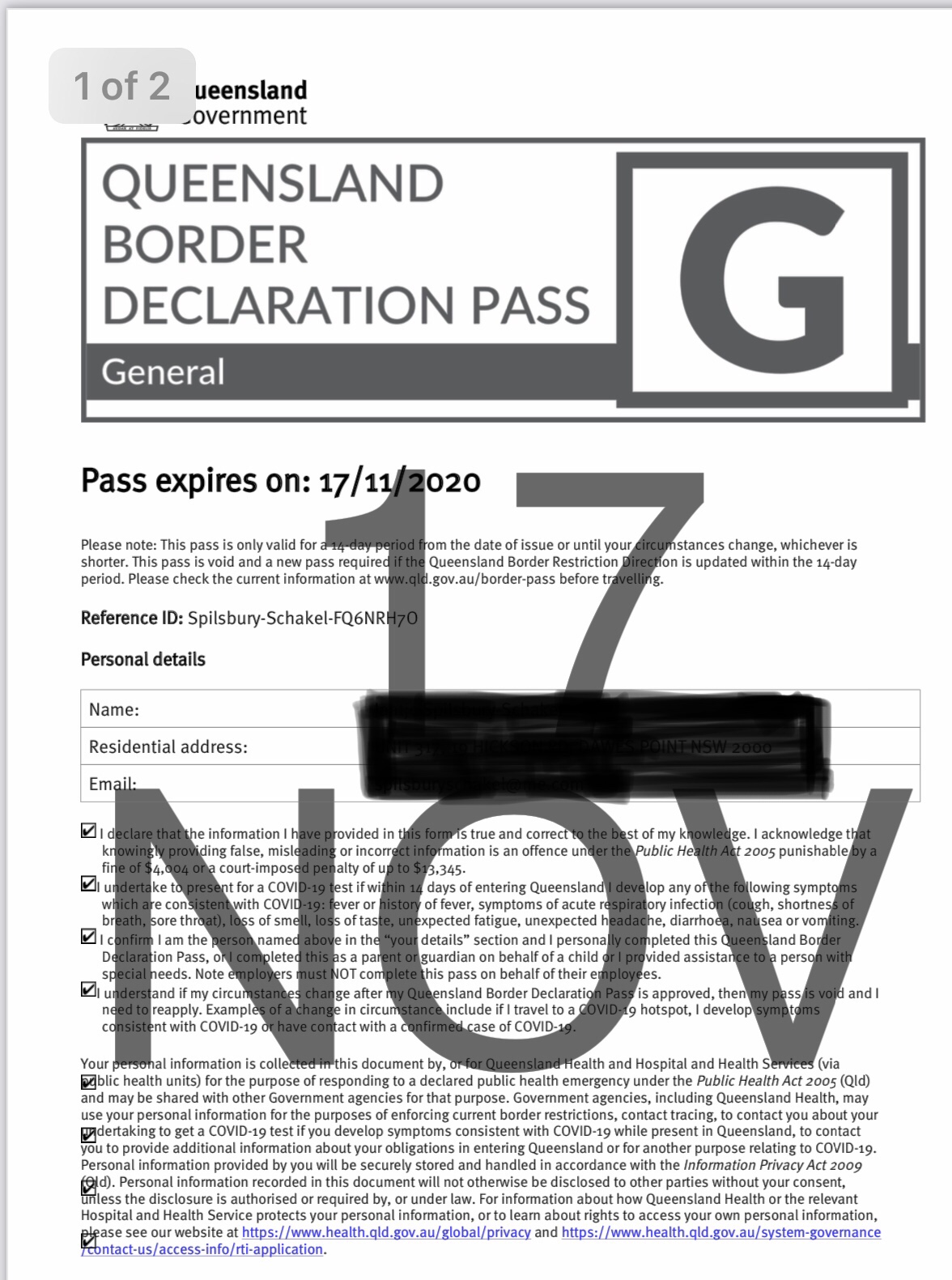 The border between Queensland and NSW (still excluding greater Sydney) finally opened up on November 3rd. As luck would have it, we were at Tenterfield at that point, only 17 km from the border. So we decided to complete the Queensland Border Declaration Pass G, as we had been outside Greater Sydney for more than 14 days.