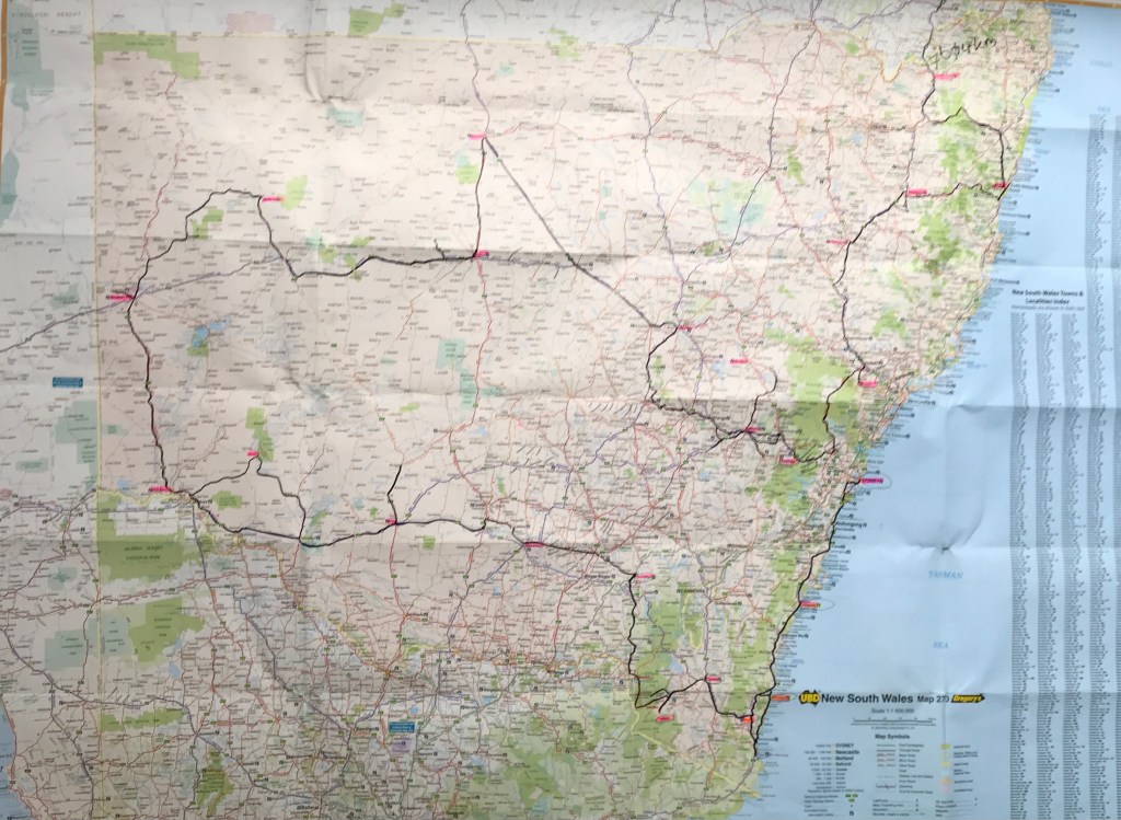 On the above map it is clearly to see that we first headed south, hugging the Pacific Ocean until we nearly hit the Victoria border. We then turned west, following that border. We next drove through the outback from Broken Hill to Bourke. And then turned back east towards the lush green of the high country and the dividing range, which we transected a number of times as we moved slowly north.