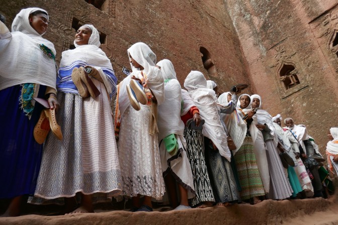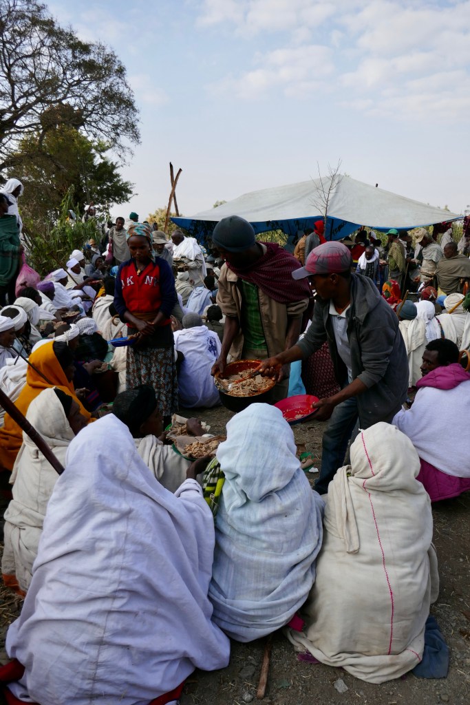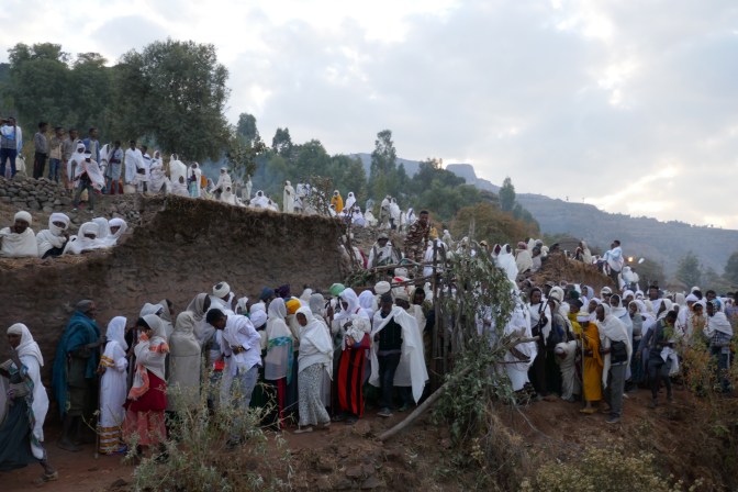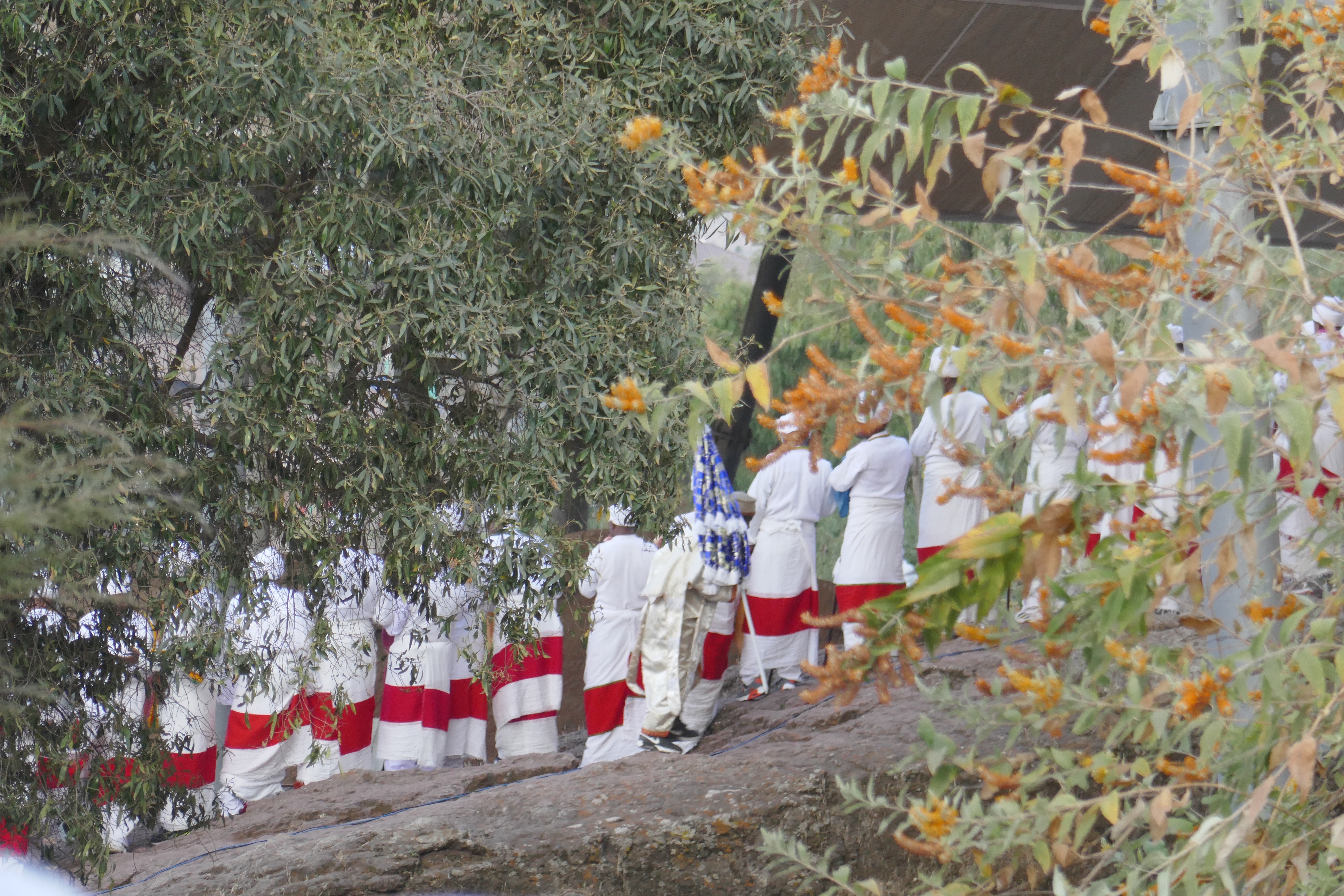 We walk to Bet Maryam (St Mary’s Church) to catch part of the Christmas Service. People have been praying here since last night and the service here is broadcast to all of Ethiopia. What greets us is a site of biblical proportions. People are everywhere, on the hillside, in the trees, all clad in white and holding wax candles.
