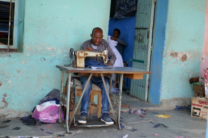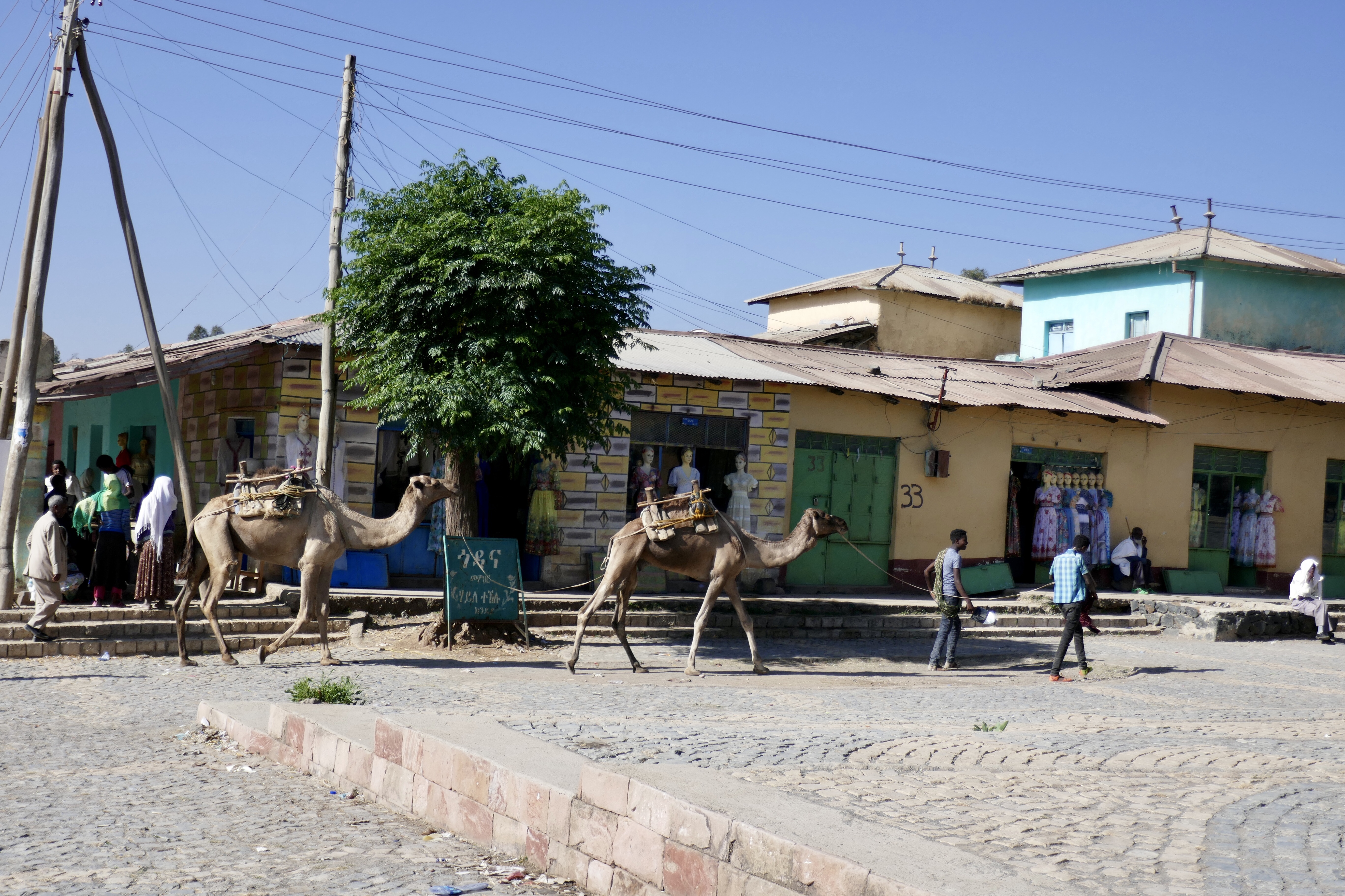 Taylors are sitting on the pavement with their sewing machines. Donkeys and camels carry their loads through town, flocks of livestock cross the roads, and groups of children head home from school.