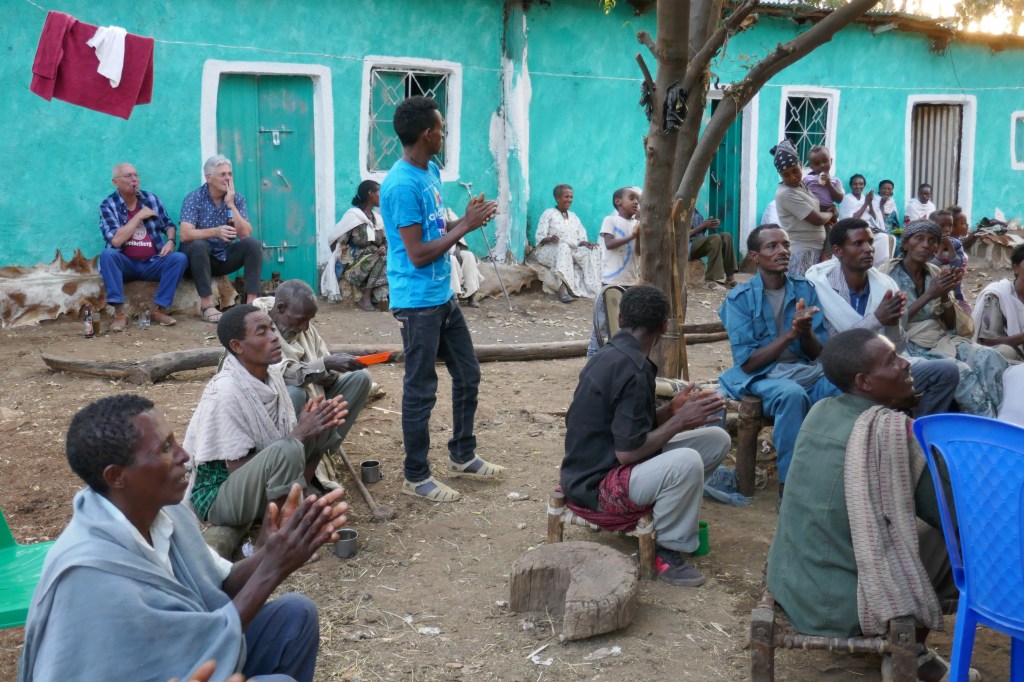 We start off in two groups, the men sitting around the back patio of Lina’s parents house, and the women along the new guest wing. However, once the music, singing and dancing starts, the two groups quickly merge. Freshly brewed local mead (Tala) is served.