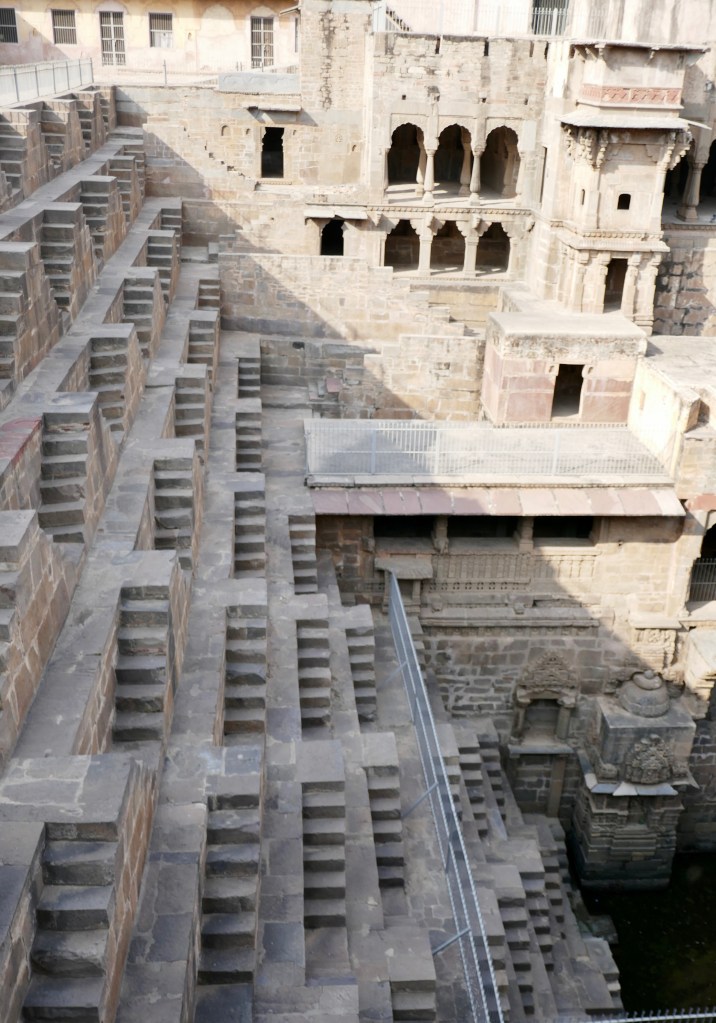 The Chand Baori is one of the oldest Baori (step wells) in Rajasthan, and was built by King Chanda of the Nikumbha Dynasty during the 8th and 9th century AD. This nearly 30 metre deep Baori is square, and provides wonderful geometric flights of steps on three sides. It feels like stepping into an Esher lithograph! (M. C. Escher – Wikipedia)