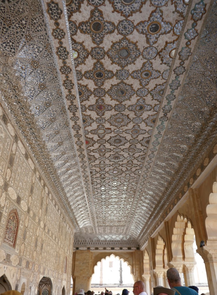 The fort is an amazing place to wander about. We have a guide taking us on a tour and provide us with the historical background, and then get an hour to walk around ourselves. We admire the gardens in the third courtyard, google at the large number of tourists posing at the Ganesh Pol, and wait in line to admire the Sheesh Mahal, the Mirror Hall. The mosaics and frescoes are amazing, and the millions of small mirrored tiles in the Mirror Hall are stunning.