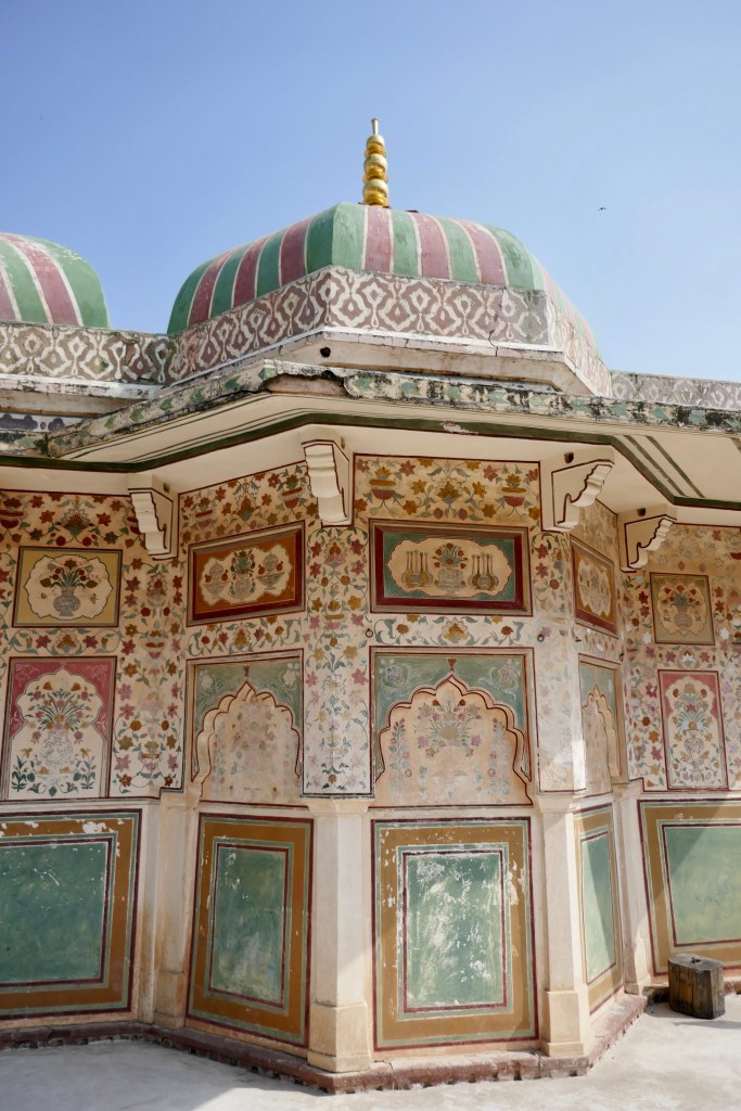 The Palace of Man Singh I is the oldest part of the Amber Fort and has a large pavilion in its centre. I can just imagine this pavilion decorated with layers of carpets and cushions, and screened with curtains, when it was still in use as a private meeting room for the queens (Maharanis). Today it provides a nice shady place for visitors wrapping up their tour of the fort.
