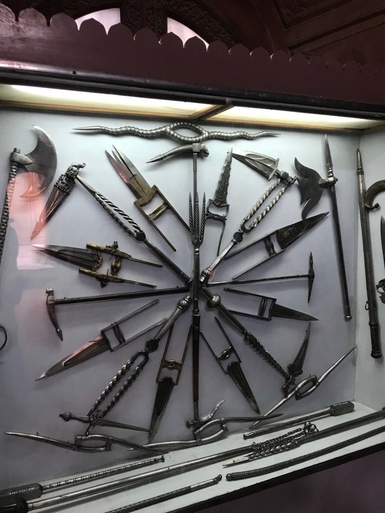 Interestingly, the fort also has an old aircraft parked in the centre of the museum area. This World War I bomber was rebuild from pieces, presented by the British Government to Bikaner in recognition of the services rendered by the Bikaner State Forces, led by Maharaja Ganga Singhji of Bikaner, during the 1st World War. In 1914, Maharaha Ganga Singh offered the British a 500-strong camel corps which was deployed in Egypt. It defended the Suez canal from Turkish advances so successfully, that more camel mounted regiments were formed. The airplane was put together from pieces by local craftsmen, who filled in “the gaps” as they saw best. No wheels, no worries, the wheels from a wheelbarrow will do….