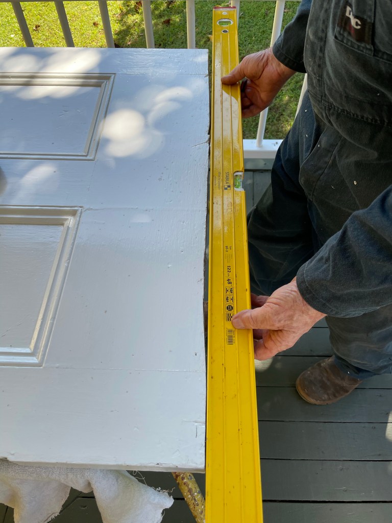Not only do we now have two outside doors that actually close properly, he also took on the challenge of the master bedroom door. This door had a gap underneath varying between 30 to more than 60 mm, and the door didn’t close at all. Dave took the door off its hinges, planed it, put a new section under it, worked with the frame, and with the original 150 year old door lock, and we now have a rectangular door which closes smoothly on its original cast iron lock. I don’t know who was more excited, Dave or us!