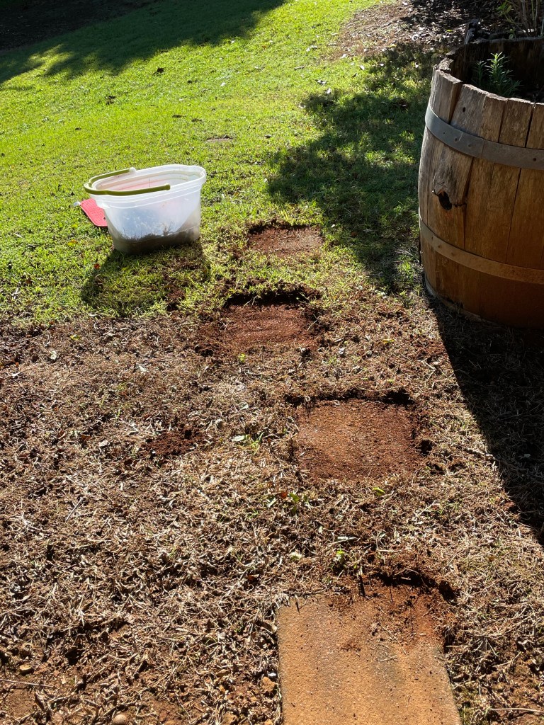 A couple of afternoons digging unearthed a stepping stone path leading to a straggly looking mulberry tree.