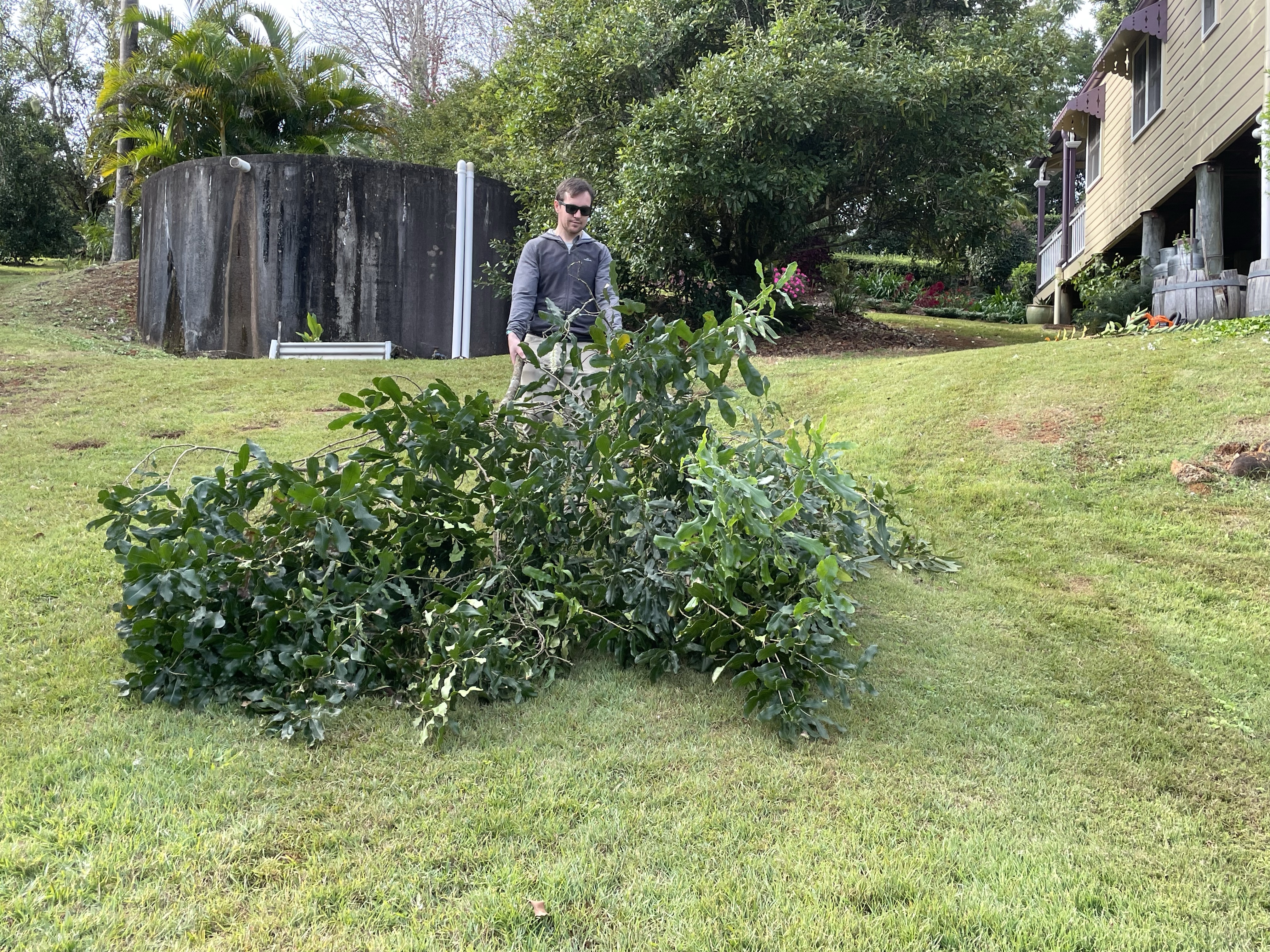The side are flanked by rows of macadamia nut trees, which have been dropping their nuts since we arrived. These can be lethal projectiles when caught in a lawn mower!